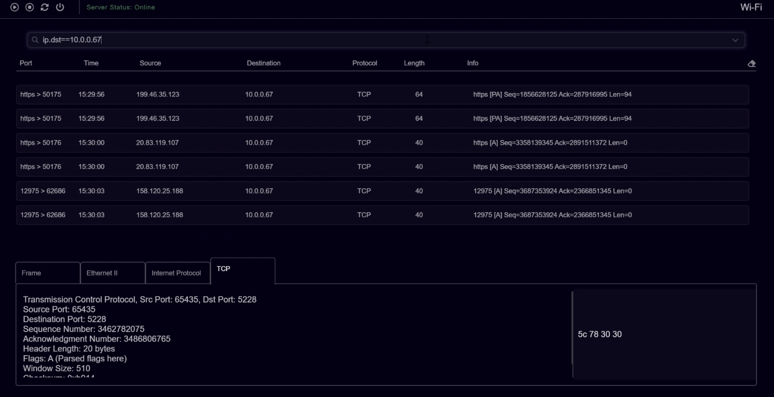 En tant que développeur unique, j'ai bâti une application native complète intégrant une interface Electron et un backend de traitement de données. J'ai utilisé la bibliothèque Scapy en Python pour piloter la capture de paquets et l'analyse des trames. J'ai programmé toute la logique permettant de décortiquer les protocoles Ethernet, IP, TCP et UDP, afin d'afficher des informations structurées et compréhensibles dans l'application. J'ai également conçu le système de filtrage et la sélection d'interfaces réseau pour offrir un outil d'analyse fonctionnel et intuitif.